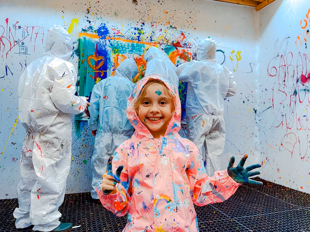 Avec breushDAYKIDS, chaque enfant a sa propre toile, son espace et son rythme.Ils enfilent leur combinaison, choisissent leurs couleurs, attrapent nos accessoires rigolos et peignent librement, en musique, dans une ambiance immersive et joyeuse.