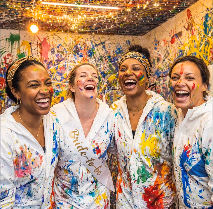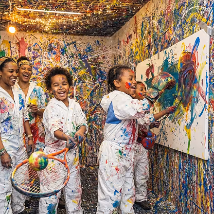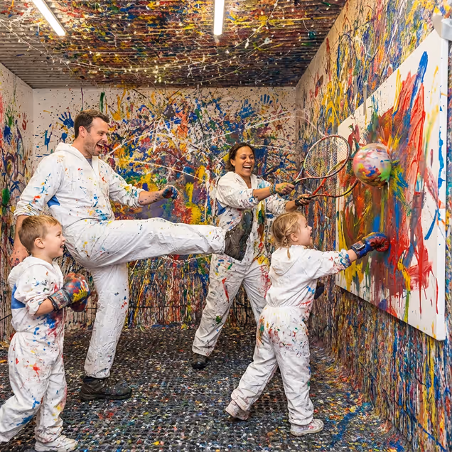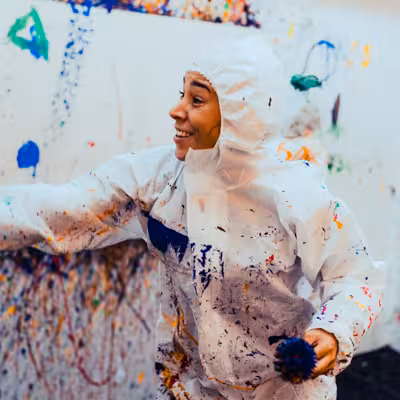 Tu enfiles ta combinaison, tu choisis tes couleurs, tu prends nos accessoires (gants de boxe, balles, brosses toilettes, outils fun…)et tu balances la peinture sur une toile XXL, sans règle, sans pression.